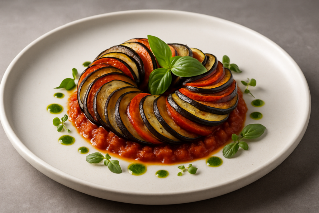 Mes chers gourmands, laissez-moi vous raconter comment cette ratatouille revisitée est née dans ma cuisine. L’été dernier, lors d’un séjour chez des amis près d’Avignon, j’ai découvert un petit producteur bio qui cultivait les plus belles aubergines que j’aie jamais vues. De retour à Lyon, j’ai voulu créer quelque chose de différent, en m’inspirant de mes voyages en Thaïlande.
