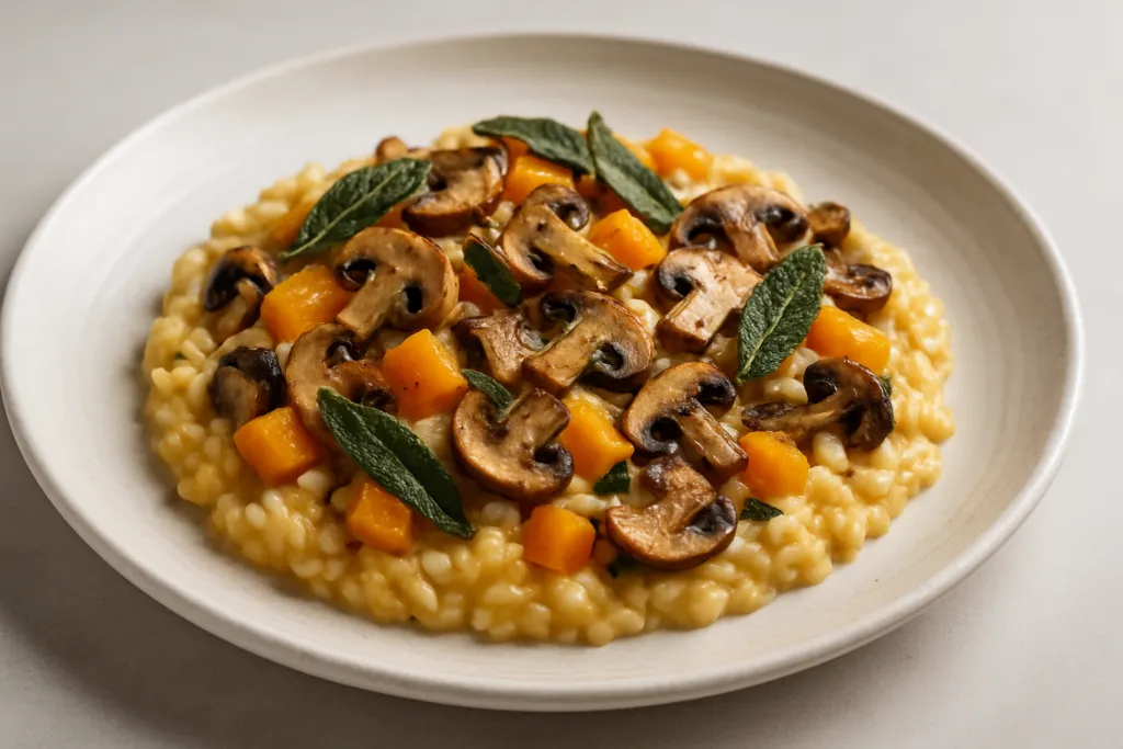 Ce risotto automnal est remarquablement équilibré nutritionnellement. La courge butternut apporte une excellente source de bêta-carotène (vitamine A), essentielle pour la vision et l’immunité. Elle fournit également des fibres et du potassium. Les champignons sont riches en sélénium et en vitamines B. Le riz Arborio apporte des glucides complexes pour l’énergie, tandis que le parmesan ajoute des protéines et du calcium. La sauge possède des propriétés antioxydantes et digestives.