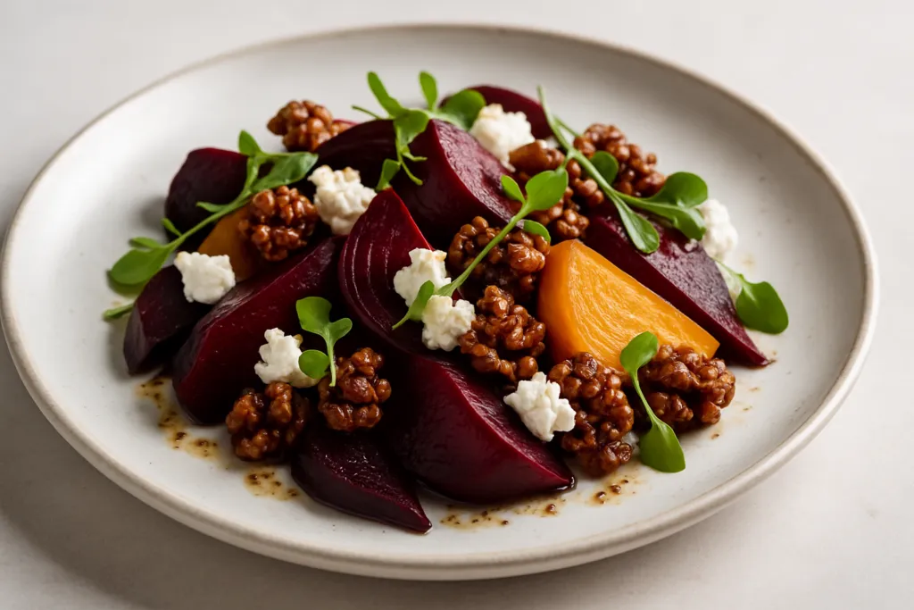 Cette salade de betteraves rôties au chèvre et noix caramélisées incarne parfaitement l’art culinaire français : simplicité, qualité des produits et harmonie des saveurs. Les betteraves, rôties au four, révèlent toute leur douceur naturelle tandis que le fromage de chèvre frais apporte une note crémeuse qui contraste délicieusement avec le croquant des noix caramélisées.