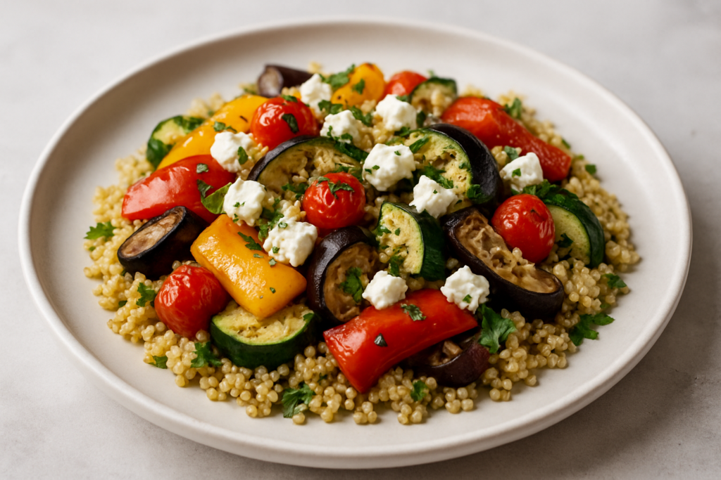 Cette salade de quinoa aux légumes grillés et feta est la solution parfaite pour un repas rapide, sain et savoureux. En seulement 30 minutes, vous obtenez un plat complet qui allie les bienfaits du quinoa aux saveurs méditerranéennes des légumes grillés et de la feta crémeuse. Une recette idéale pour les journées chargées !