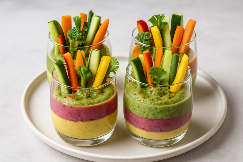 Qui a dit qu’un apéritif ne pouvait pas être à la fois délicieux et nutritif ? Ces verrines de houmous coloré prouvent le contraire ! Avec leur base crémeuse de pois chiches et leur garniture de légumes croquants, elles apportent protéines végétales, fibres et vitamines à votre table d’apéro.